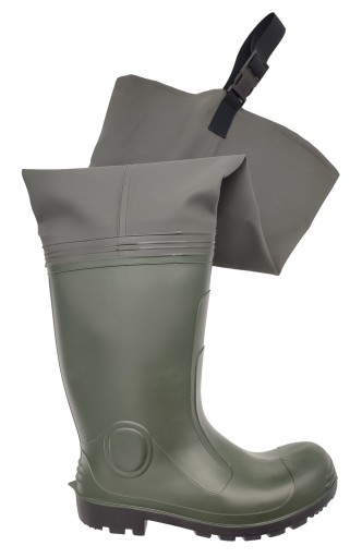 REWELACYJNE, WYTRZYMAŁE WYSOKIE BUTY RYBACKIE Z WGRZANYMI NA STAŁE KALOSZAMI.