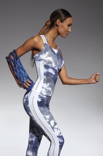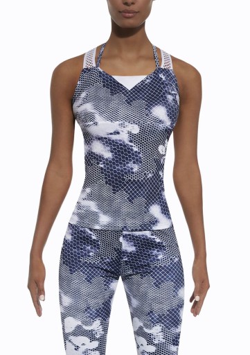 Top sportowy z nadrukiem po zewnętrznej stronie oraz białymi paskami z dodatkiem siatki po bokach.