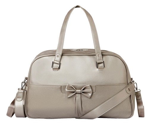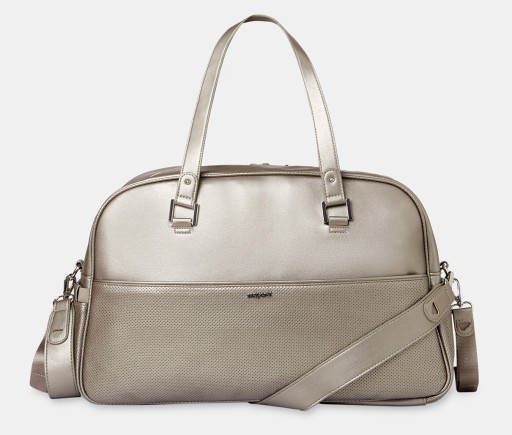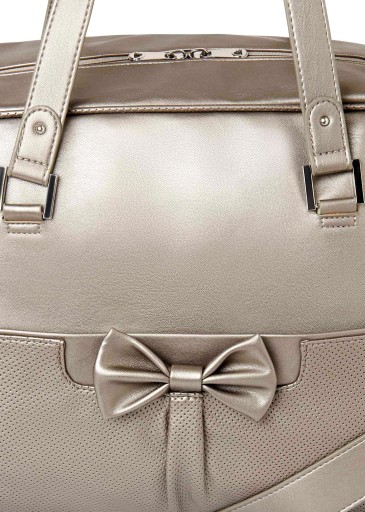 Nowoczesny materiał zewnętrzny z imitacji skóry. Zapięcie na suwak. Wyposażona w zdejmowane paski do zawieszenia, które w prosty sposób można przypiąć do wózka. Długi pasek do noszenia na ramieniu. Dwie otwarte kieszenie z gumkami po bokach oraz dwie płaskie, jedna z przodu i druga z tyłu. Wewnątrz dwie kieszonki otwarte i jedna duża zapinana na suwak. Woreczek na brudne ubranka. Kolor : mosiężny-metalizowany ( odcień beżu / szarości)