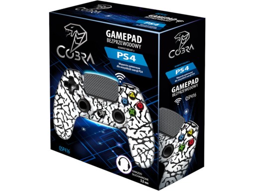 Kontroler COBRA QSP416 to akcesorium, dzięki któremu gra na urządzeniu PlayStation 4 stanie się jeszcze większą przyjemnością. Sprzęt ten wyposażony został w ergonomiczne przyciski, podświetlany przycisk HOME, przyciski boczne oraz frontową płytę, która informuje światłem LED o stanie podłączenia oraz naładowania baterii, a także dwa silniki wibracyjne.