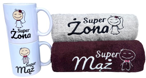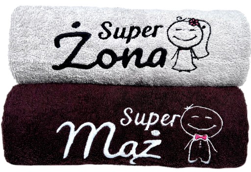 - zestaw dużych, grubych ręczników łazienkowych 50x100cm z haftem Super Żona/ Super Mąż,
