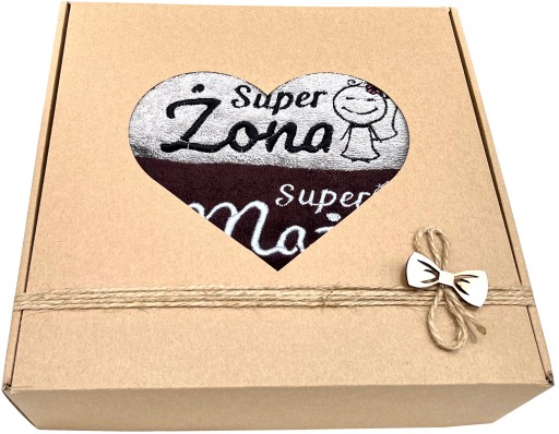 z grubej eko tektury oraz z naturalnymi ozdobami pięknie się prezentuje i stanowi gotowy do wręczenia prezent. Po wyciągnięciu ręczników i kubków może posłużyć, jako doskonałe miejsce na pamiątki ze ślubu lub rocznicy ślubu.