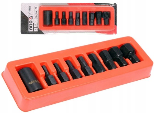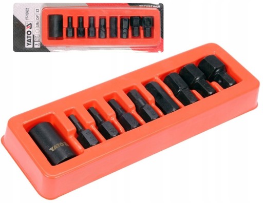 Profesjonalny zestaw udarowy YATO, służący do odkręcania śrub specjalnych typu hex. Różnorodność rozmiarów zapewnia możliwość wykonania wielu prac w specjalistycznych serwisach mechanicznych i samochodowych. Końcówki o długości 38 mm mocowane są w uchwycie sześciokątnym dostosowanym do współpracy z kluczami udarowymi 1/2 cala. Zestaw wykonane z najwyższej jakości stali stopowej narzędziowej S2 oraz CrMo.