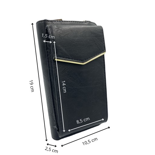 - Wymiary części z portfelem: 19 cm x 10,5 cm x 2,5 cm