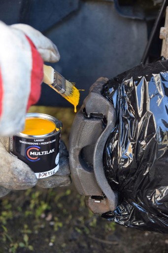 - Nanieść 2-3 warstwy w odstępach 15-30 min w zależności od temperatury (lakier powinien być lekko klejący ale już nie brudzący). Nie dopuszczać do zamalowania lakierem elementów ciernych, przewodów oraz części ruchomych hamulca.