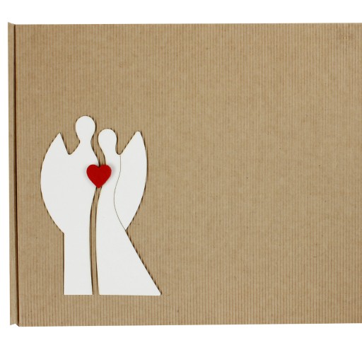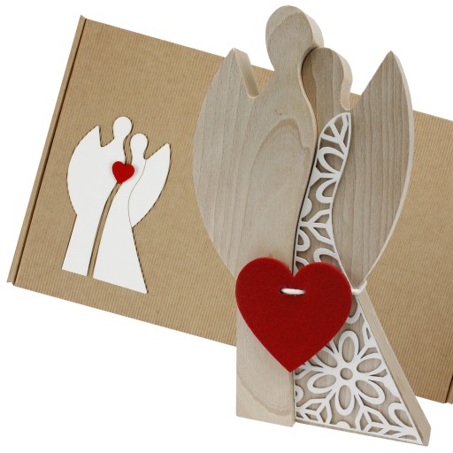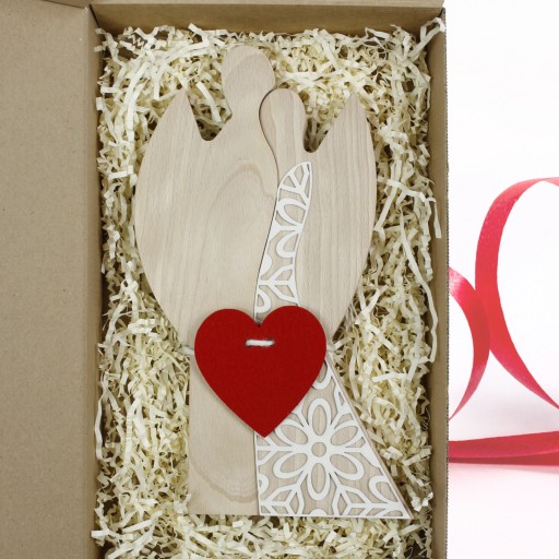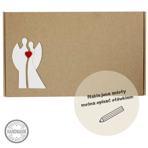 - Ozdobne karbowane pudełko wypełnione wełną drzewną z naklejonymi emblematami postaci tych samych aniołów, które są w zestawie oraz filcowym serduszkiem.