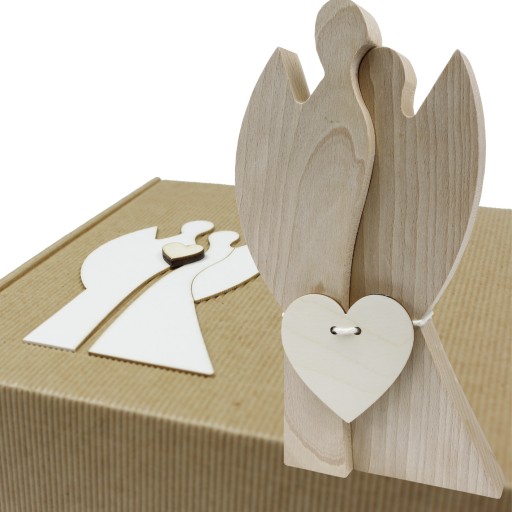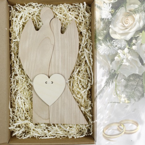 - Ozdobne karbowane pudełko wypełnione wełną drzewną z naklejonymi emblematami postaci tych samych aniołów, które są w zestawie oraz drewnianym serduszkiem.