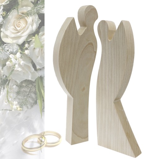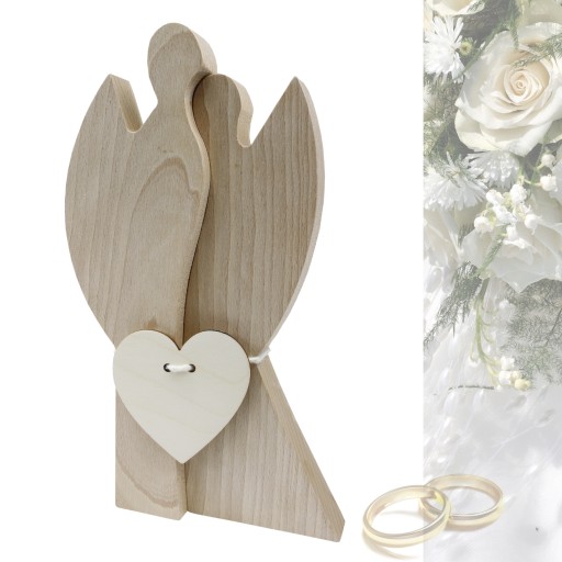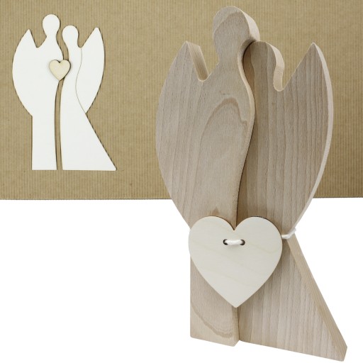 - Dwa Anioły wysokość 26 cm, grubość 2,5 cm. Anioły wykonane są z drewna bukowego, związane sznureczkiem z emblematem w kształcie serca wykonanego z drewna.