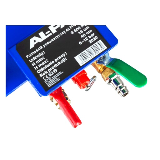 - W podnośniku zastosowano 2 zawory - wlotowy i wylotowy. Takie rozwiązanie zapewnia najwyższy komfort pracy oraz możliwość odłączenia źródła powietrza po napompowaniu bez groźby niekontrolowanego opadnięcia podnośnika.