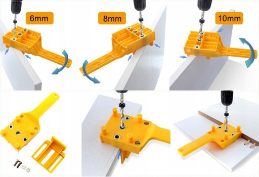 Przyrząd przeznaczony do wykonywania otworów dla połączeń narożnikowych, typu "T" i "E" oraz "L" przy użyciu kołków 6, 8 lub 10 mm w drewnie i płytach wiórowych o grubości do 30 mm.