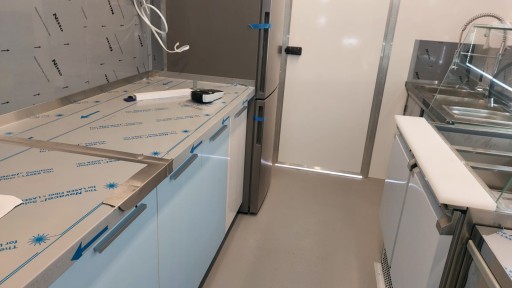 Kompletnie wyposażona w meble technologiczne z częściami ze stali nierdzewnej i urządzenia gastronomiczne. Zabudowa meblowa składająca się z blatów roboczych, stołów, komór zlewowych, umywalki, szafki BHP, półek.