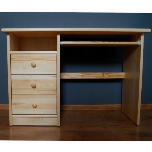 Drewniane biurko wykonane w całości z solidnego, litego drewna sosnowego. Jedynie ścianka tylna oraz dna szuflad z płyty pilśniowej. W szufladach zamontowane solidne metalowe prowadnice rolkowe. Uchwyty w formie gałek.