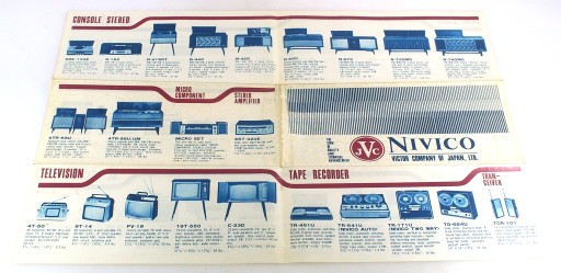 JVC NIVICO wczesny prospekt z początku lat 70-tych sprzętu firmy JVC, stan bdb-, język angielski, 10x21 cm przed rozłożeniem, 30x42 po rozłożeniu, lekko czuć zapach strychu.