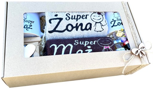 z grubej eko tektury oraz z naturalnymi ozdobami pięknie się prezentuje i stanowi gotowy do wręczenia prezent. Po wyciągnięciu ręczników i kubków może posłużyć, jako doskonałe miejsce na pamiątki ze ślubu lub rocznicy ślubu.