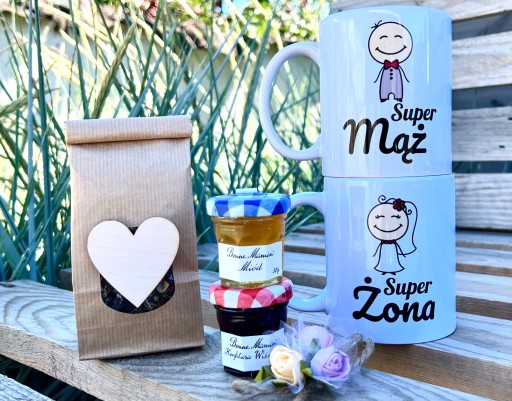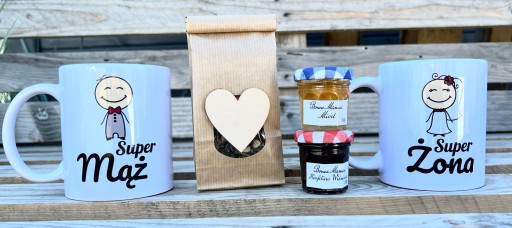 - 2 kubki ceramiczne z nadrukiem obustronnym Super Żona/ Super Mąż, pojemność 330 ml, można myć w zmywarce,