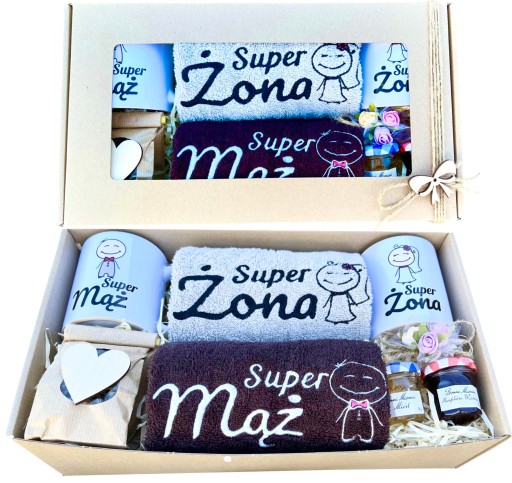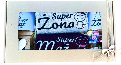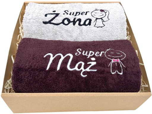 - zestaw dużych, grubych ręczników łazienkowych 50x100cm z haftem Super Żona/ Super Mąż,
