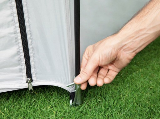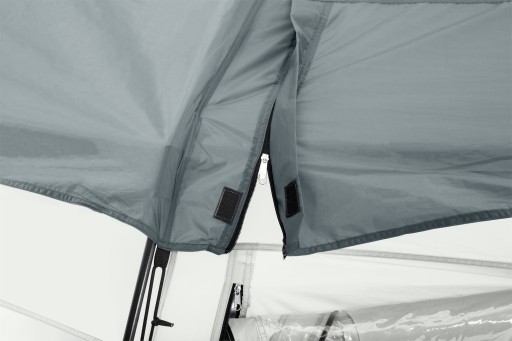 Stabilność i wytrzymałość konstrukcji gwarantuje stelaż wykonany z włókna szklanego. Rozsuwane drzwi pozwalają na dowolne zaaranżowanie otaczającej przestrzeni. Można pozostawić jedynie główną kopułę i korzystać z uroków bliskiego kontaktu z naturą bądź zasunąć wszystkie drzwi i stworzyć maksymalnie intymną atmosferę. Namiot posiada w zestawie także moskitierę, która uniemożliwia owadom przedostawanie się do jej wnętrza. Ten duży przenośny namiot może być także używany jako przestronna altana ogrodowa, przedsionek do przyczepy kempingowej bądź w każdy inny sposób odpowiadający indywidualnym potrzebom.