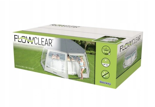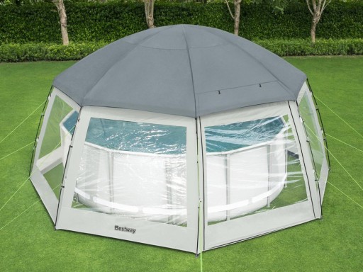 Jeszcze większy komfort korzystania z ogrodowego basenu, jacuzzi czy spa jest teraz możliwy dzięki zastosowaniu tego wyjątkowo dużego namiotu firmy BESTWAY który będzie doskonałym dodatkiem do luksusowego centrum relaksu przy domu.
