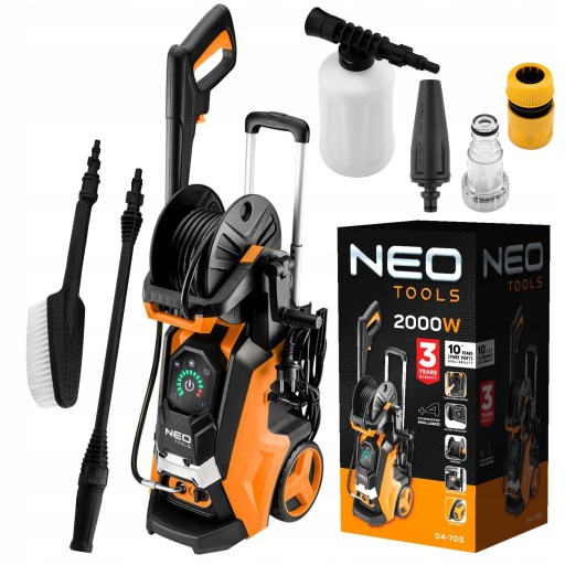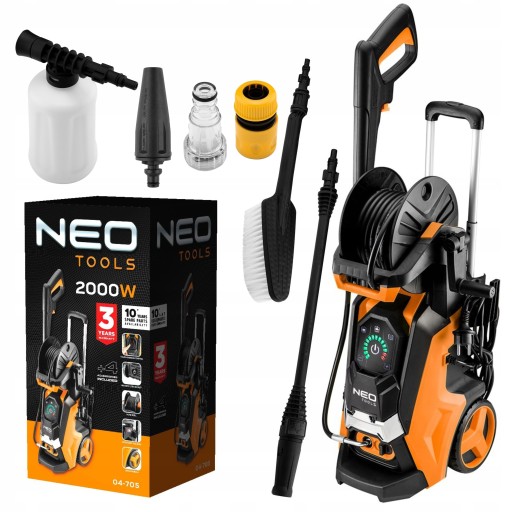 Myjka ciśnieniowa 2000 W, ciśnienie 100 (maks 150 bar) 04-705 NEO jest nowoczesnym urządzeniem zaprojektowanym z myślą o oszczędzaniu wody, czasu oraz ułatwianiu sezonowych porządków.