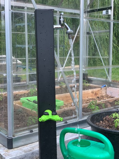 Na tylnej ściance słupka, na wysokości 50 cm zamocowany jest rozdzielacz 1/2 (dwa wyjścia na szybkozłączki z zaworkami umożliwiającymi rozprowadzenie dodatkowych węży, podłączenie do linii kroplujących lub sterownika automatycznego podlewania).