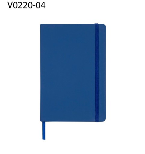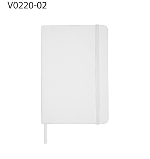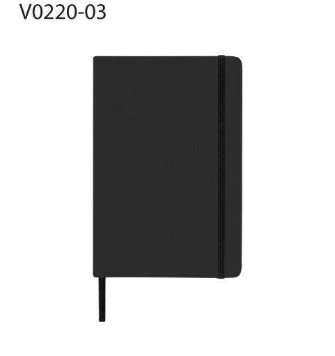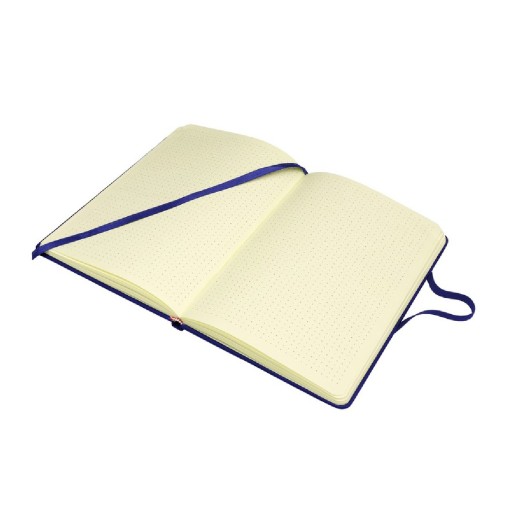 Notatnik A5 (96 kropkowanych kartek), tasiemka zakładkowa i elastyczna opaska do zamykania.