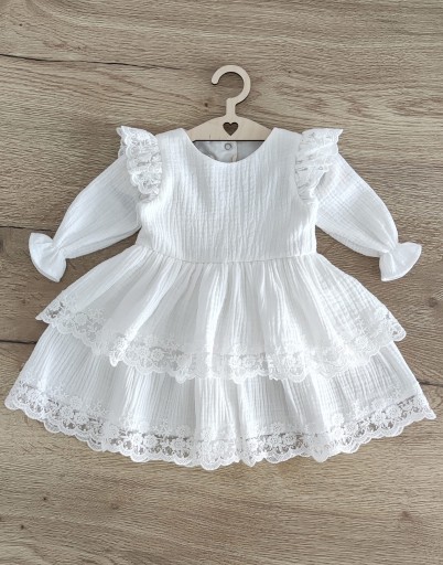 Sukienka Blanca w kolorze śmietankowym. Wykonana z muślinu bawełnianego, obszyta bawełnianą koronką.