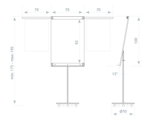 Tablica suchościeralna o właściwościach magnetycznych. Konstrukcja popielata z eleganckimi grafitowymi wykończeniami. Rama aluminiowa zapewnia stabilizację oraz podnosi estetykę produktu. Tablica ma stały kąt nachylenia wynoszący 15°. Blok zawieszany jest na uchwytach. Stojak tablicy posiada możliwość regulacji wysokości od 175 do 195 cm. Podstawę wyposażono w kółka z systemem blokowania, zapewniające stabilność produktu i ułatwiające jego przemieszczanie. Istnieje możliwość zawieszenia bloku o formacie A1 i EURO, poprzez odpowiednie ustawienie rozstawu haków. Dodatkowe 2 aluminiowe ramiona, do zawieszenia arkuszy papieru.