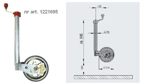 Przedmiotem sprzedaży jest oryginalne koło podporowe firmy AL-KO. Koło o średnicy 48 mm wyposażone jest w wagę. Solidne wykonanie przez renomowanego producenta przekłada się na nośność statyczną aż 300 kg. Przedmiot posiada szerokie koło 230 x 80 dzięki czemu manewrowanie przyczepą jest jeszcze łatwiejsze. Koło posiada wskaźnik obciążenia. Łożysko tłoczone umieszczone w korbie sprawia, że manewrowanie nią jest łatwe. Koło jest świetnie zabezpieczone przed korozją. Gruba wartswa cynku sprawia, że koło służy użytkownikom przez długie lata.