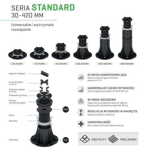 -WSPORNIKI REGULOWANE od 17 mm - 900 mm z płynną regulacją wysokości na gwincie oraz dodatkowo głowice samopoziomujące, . Wsporniki regulowane dzięki dodatkowym adapterom znajdują zastosowanie do montażu legarów.