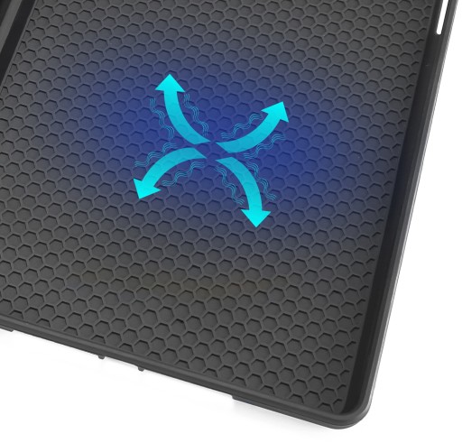 - Tył wykonany w oparciu o technologię imitującą plaster miodu, co pozwala ograniczyć nagrzewanie się urządzenia