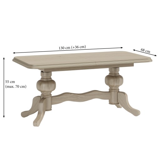 - Rozsuwanie blatu umożliwiają metalowe kulowe prowadnice które się nie zacinają podczas rozkładania. Podnośnik manualny blatu jest wsadem metalowym zamontowanym w nodze