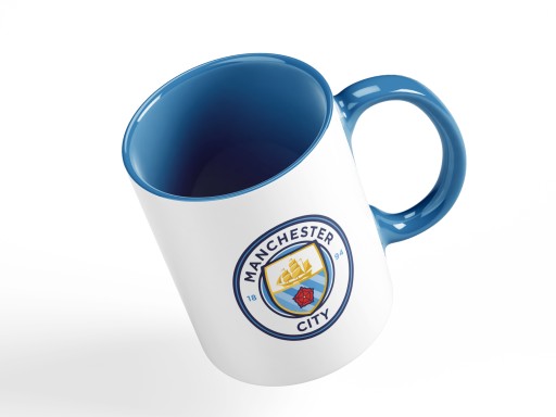 Kubek ceramiczny z nadrukiem Manchester City #the_citizens. Idealny na upominek dla fana. Dwukolorowy: biały z błękitnym wnętrzem oraz uchwytem.