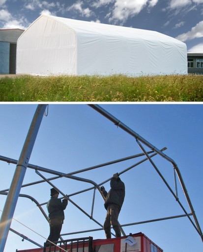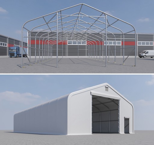 Konstrukcja, plandeka, ściana szczytowa z dużą bramą i wejściem dla ludzi.