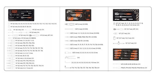 - Nasadki 1/4": 3.5, 4.0, 4.5, 5.0, 5.5, 6.0, 7, 8, 9, 10, 11, 12, 13, 14mm; E4, ES, E6, E7, ES