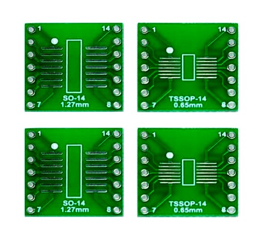 Uniwersalna przejściówka, adapter PCB umożliwiający wykorzystanie układów SMD w obudowach SSOP14 0,65mm oraz SOP14 1,27mm we własnych projektach w technologii przewlekanej THT. Możliwe jest zastosowanie analogicznych układów o mniejszej liczbie nóżek. Zdjęcia przedstawiają obie strony płytki PCB. Na płytce znajdują się również dwa otwory montażowe M2.