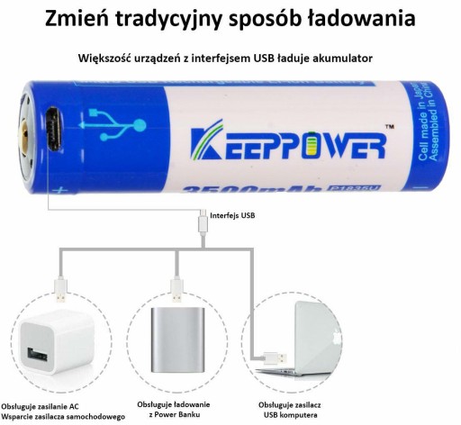 Rewolucyjny akumulator litowo-jonowy ICR14500, zaprojektowany z wbudowanym portem ładowania micro-USB. Koniec z dodatkową ładowarką, ponieważ akumulator można ładować bezpośrednio za pomocą standardowego kabla ładującego micro-USB. Wystarczy podłączyć ogniwo, do dostępnego źródła zasilania, a czerwona dioda kontrolna, pod biegunem dodatnim zmieni kolor, po zakończeniu ładowania. Dzięki wbudowanemu inteligentnemu obwodowi ładowania i zintegrowanym funkcjom bezpieczeństwa, akumulator będzie działał bezpiecznie w większości urządzeń kompatybilnych z rozmiarem 14500. Akumulator posiada nietypowe napięcie pracy 1,5V.