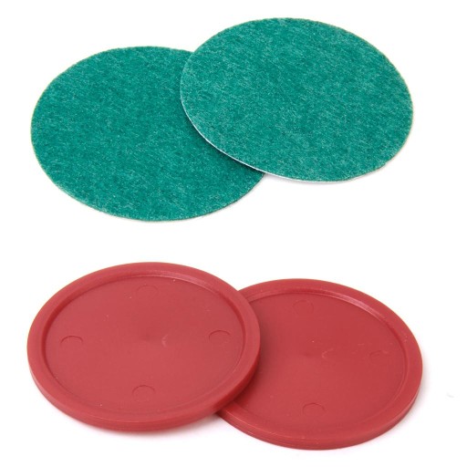 Zestaw dwóch popychaczy hokejowych i dwóch krążków hokejowych Dwa popychacze są w kolorze czerwonym z na dole Dwa czerwone krążki do hokeja na okrągłym stole Materiał: tworzywo sztuczne Rozmiar popychacza: około 3 cali (7,5 cm) średnicy i 2 1/4 cala (6 cm) wysokości Rozmiar krążka: około 2 1/2 cala (6,3 cm) średnicy