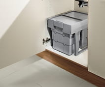 System segregacji odpadów Hafele 1DWA3 świetnie sprawdzi się w przypadku szafek z frontem uchylnym. Dostępne w konfiguracji 2x16l lub 1x16l + 2x7l pozwalają na dopasowanie wariantu wedle Państwa potrzeby. Każdy pojemnik ma swój uchwyt, co umożliwia na swobodne wyciąganie zawartości kosza.