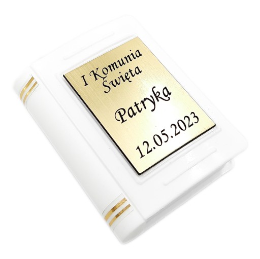 Na pudełku umieścimy dla Państwa blaszkę z grawerowanym napisem " I Komunia Święta" oraz imieniem dziecka oraz datą uroczystości.