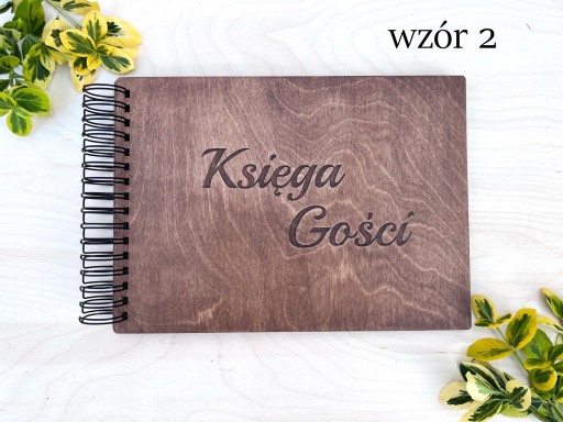 - we wzorze 1 - na przedniej okładce przyklejony drewniany napis "Księga Gości" z jasnej sklejki,
