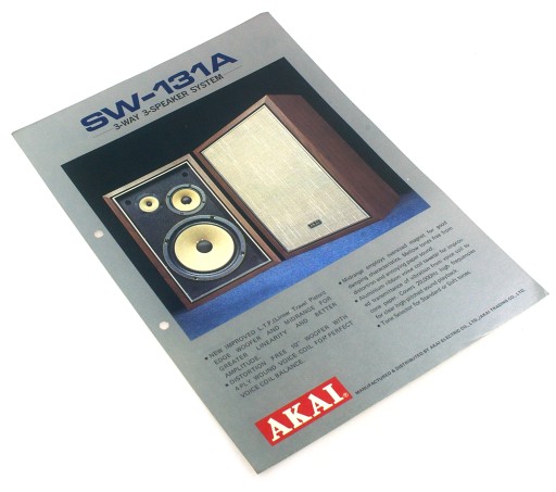 AKAI SW-131A 3-WAY 3-SPEAKER SYSTEM, Wyd. AKAI ELECTRONIC CO LTD około 1970-1975, s. 2, stan bdb-, j. angielski, format A4. Zawiera specyfikację techniczną sprzętu. Lekko czuć zapachem strychu. Printed in Japan.
