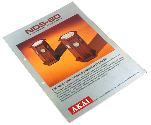 AKAI NDS-80 OMNIDIRECTIONAL 7-SPEAKER SYSTEM, Wyd. AKAI ELECTRONIC CO LTD około 1970-1975, s. 2, stan bdb-, j. angielski, format A4. Zawiera specyfikację techniczną sprzętu. Lekko czuć zapachem strychu. Printed in Japan.