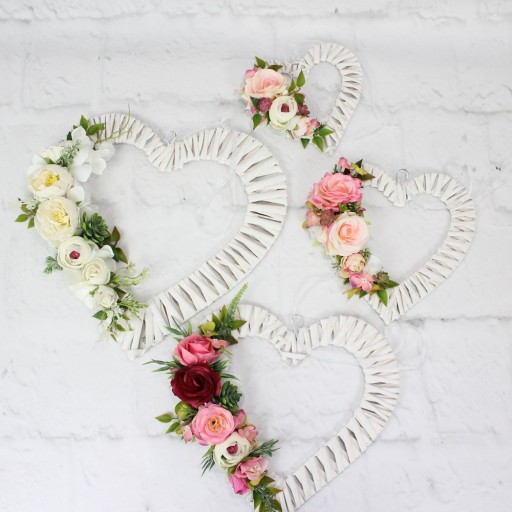 Serce wiklinowe białe o średnicy 25cm udekorowane kwiatami.