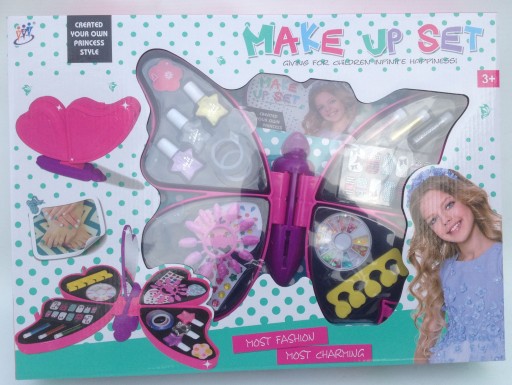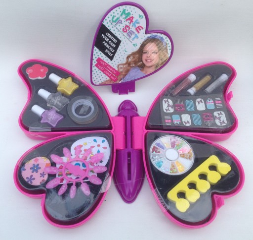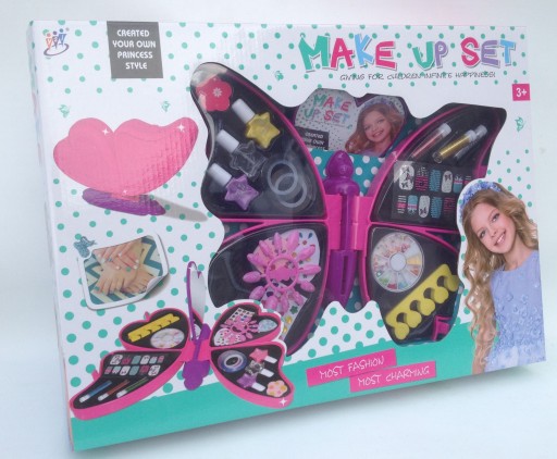 Przedstawiamy Państwu kosmetyczny zestaw piękności w kształcie motylka , niezastąpiony dla młodych dam,które lubią naśladować dorosłych. Zestaw jest zapakowany w poręczną,trzypiętrową tęczę,która z łatwością zmieści się w każdej torebce. Dzięki temu zestawowi Państwa pociechy,poprzez zabawę,rozwiną wyobraźnię,sprawność manualną i fizyczną,samodzielność i poznają podstawowy sprzęt kosmetyczny.