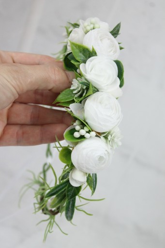 Piękny i subtelny wianek ślubny, upleciony z kwiatów róż, pełnika oraz eleganckich zielonych dodatków traw, idealnie wpisujących się w obecne trendy.