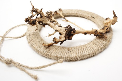 Podstawą dekoracji jest obręcz o średnicy 14cm, a jej elementy (korzenie i korona drzewa) wychodzą poza jej obrys.