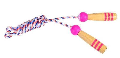 Kolorowa i wysokiej jakości skakanka zapewniająca sportowy i zabawny czas zabawy. Drewniane uchwyty.