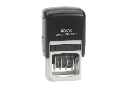 Przedmiotem jest pieczątka prostokątna z płytką tekstową Colop 52 datownik