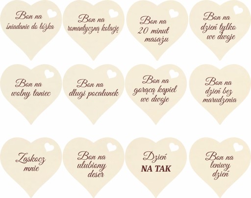 - 12 sztuk grawerowanych serduszek ze sklejki 3 mm z sympatycznymi hasłami