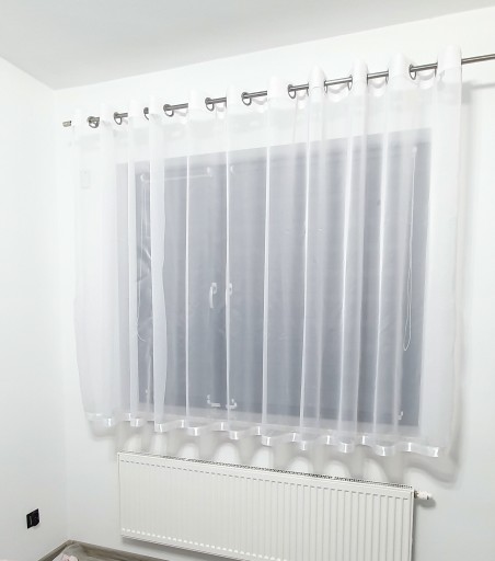 Firana została wykonana z białego woalu , dół firany został obszyty 4 cm połyskującą biała lamówką . U góry firany zostały zamontowane przelotki pozwalające zawiesić firanę na karnisz rurkowy , oczywiście można zmarszczyć tkaninę i dopasować do szerokości karnisza . Średnica przelotek ( w środku) 4 cm .